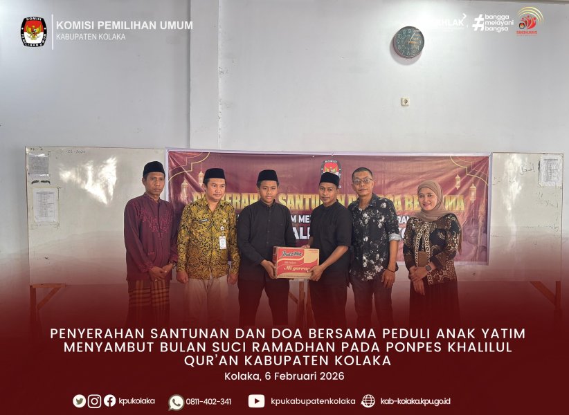 Kolaka, kab-kolaka.kpu.go.id - Komisi Pemilihan Umum (KPU) Kabupaten Kolaka menggelar kegiatan Santunan dan Doa Bersama Anak Yatim sesuai dengan Surat Edaran KPU RI Nomor 303/SDM.06.7-SD/03/2026 yang berlangsung serentak di seluruh jajaran KPU se-Indonesia pada Jumat (6/2). Kegiatan ini dilaksanakan di Pondok Pesantren Khalilul Qur'an di Kel. Balandete Kec. Kolaka. Acara dimulai pada pukul 14.00 WITA dengan pembacaan doa bersama yang dipimpin oleh Pimpinan Pondk. Setelah itu, KPU Kabupaten Kolaka menyerahkan santunan berupa bantuan kebutuhan sehari-hari kepada anak-anak yang hadir. Ketua KPU Kabupaten Kolaka dalam sambutannya menyampaikan bahwa kegiatan ini merupakan bentuk kepedulian sosial keluarga besar KPU, sekaligus upaya mempererat hubungan antara penyelenggara pemilu dengan masyarakat. Ia menegaskan bahwa selain menjalankan tugas konstitusional dalam penyelenggaraan pemilu, KPU juga memiliki tanggung jawab moral untuk berkontribusi dalam kegiatan kemanusiaan. “Kegiatan ini kami laksanakan sebagai wujud empati dan kebersamaan. Semoga dapat memberikan manfaat bagi adik-adik kita dan menjadi doa baik bagi seluruh jajaran KPU dalam menjalankan amanah penyelenggaraan pemilu,” ujarnya. Acara santunan tersebut berlangsung khidmat dan diakhiri dengan ramah tamah bersama para anak yatim serta foto bersama. Kegiatan berjalan lancar dan mendapat apresiasi positif dari masyarakat yang turut hadir. ....
