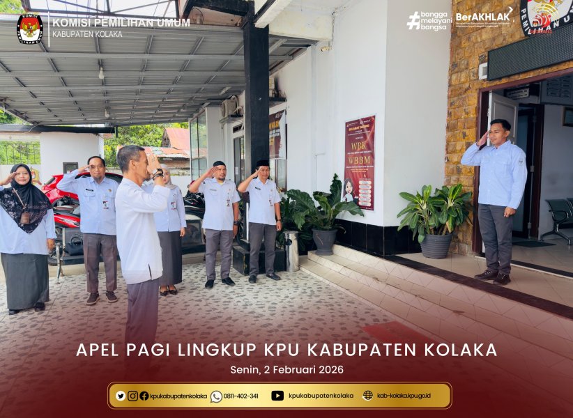 Kolaka, kab-kolaka.kpu.go.id - Mengawali aktivitas pada hari senin, 2 Februari 2026 bertempat di halaman kantor KPU Kabupaten Kolaka, Jajaran Komisioner beserta Sekretariat KPU Kabupaten Kolaka mengikuti Apel Pagi. Hadir sebagai Pembina Apel Pagi Kadiv. Parmas dan SDM KPU Kabupaten Kolaka Suparman dan Pemimpin Apel Kasubbag. Keuangan Umum dan Logistik KPU Kabupaten Kolaka Irfan Yusuf. ....