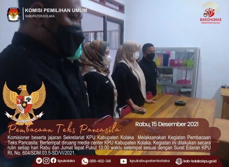 Kolaka- Rabu, (15/12/2021), Komisioner beserta jajaran Sekretariat KPU Kabupaten Kolaka Melaksanakan Kegiatan Pembacaan Teks Pancasila. Bertempat diruang media center KPU Kabupaten Kolaka.