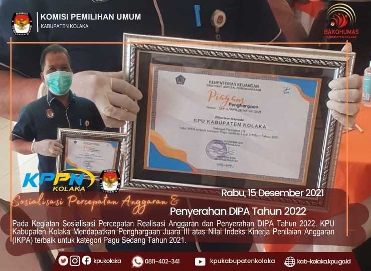Bertepatan dengan Kegiatan tersebut, KPU Kabupaten Kolaka mendapatkan Penghargaan Peringkat Ke 3 atas Nilai Indeks Kinerja Penilaian Anggaran (IKPA) terbaik untuk kategori Pagu Sedang Tahun 2021. (AndrieFH)