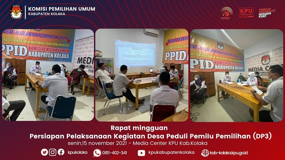 #TemanPemilih Pada hari senin, tanggal 15 November 2021 jajaran KPU Kabupaten Kolaka Mengadakan Rapat rutin mingguan bertempat di ruangan media center kantor KPU Kabupaten Kolaka. Kegiatan Rapat tersebut dihadiri oleh para Komisioner, bersama Sekretaris dan para Kasubbag KPU Kabupaten Kolaka, Kegiatan rapat tersebut yang dipimpin langsung oleh ketua KPU Kabupaten Kolaka selain membahas hal-hal penting yang menjadi konsen KPU Kabupaten kolaka sebagai penyelenggara Pemilu di wilayah kabupaten kolaka, pada Rapat tersebut juga membahas terkait Agenda Persiapan Pelaksanaan kegiatan Desa peduli pemilu dan pemilihan ( DP3). Kegiatan DP3 merupakan salah satu Program kerja KPU Kabupaten Kolaka yang termasuk dari bagian program Sosialisasi pendidikan Pemilih yang akan dilaksanakan oleh KPU Kabupaten Kolaka pada tahun ini.