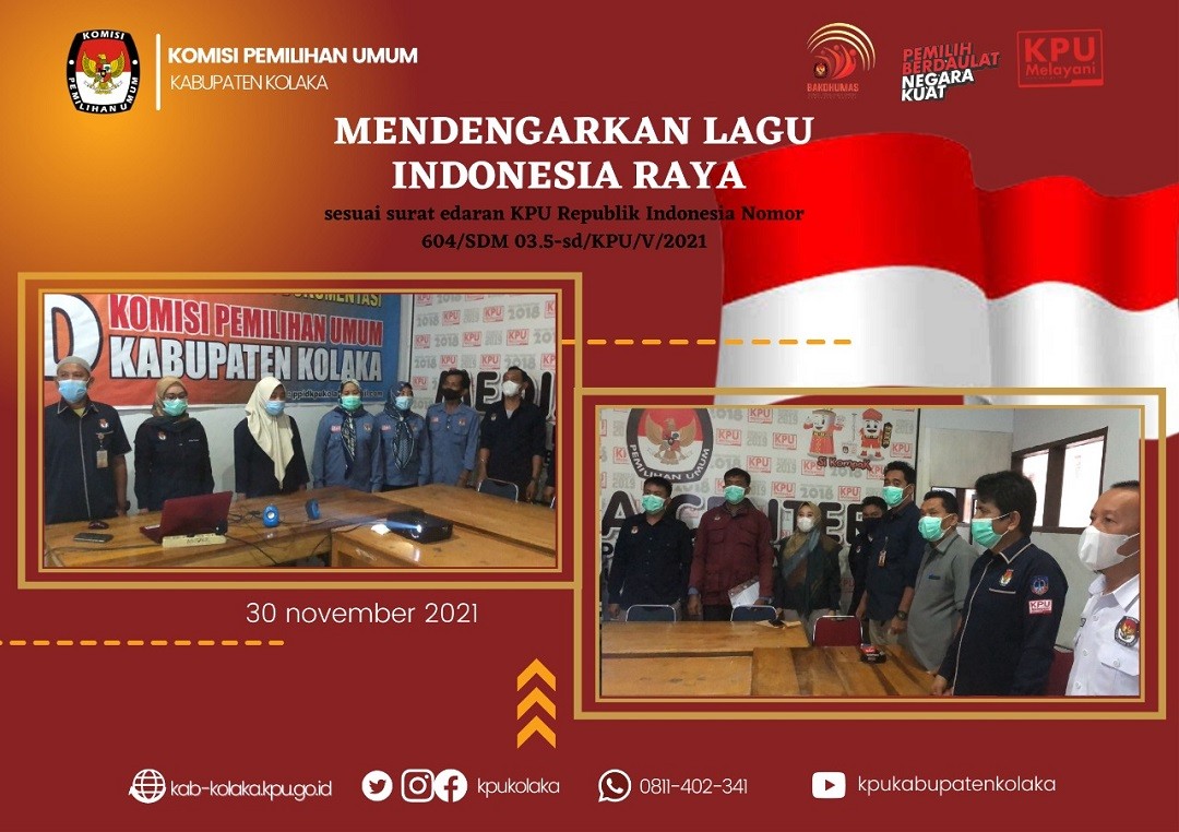Pada hari Selasa (30 November 2021) KPU Kabupaten Kolaka memperdengarkan dan menyanyikan lagu Indonesia Raya, sesuai dengan Surat Edaran KPU RI, No. 604/SDM.03.5-SD/VI/2021. Kegiatan ini diikuti oleh jajaran Komisioner KPU Kabupaten Kolaka, serta Sekretariat KPU Kabupaten Kolaka. #KPUMelayani