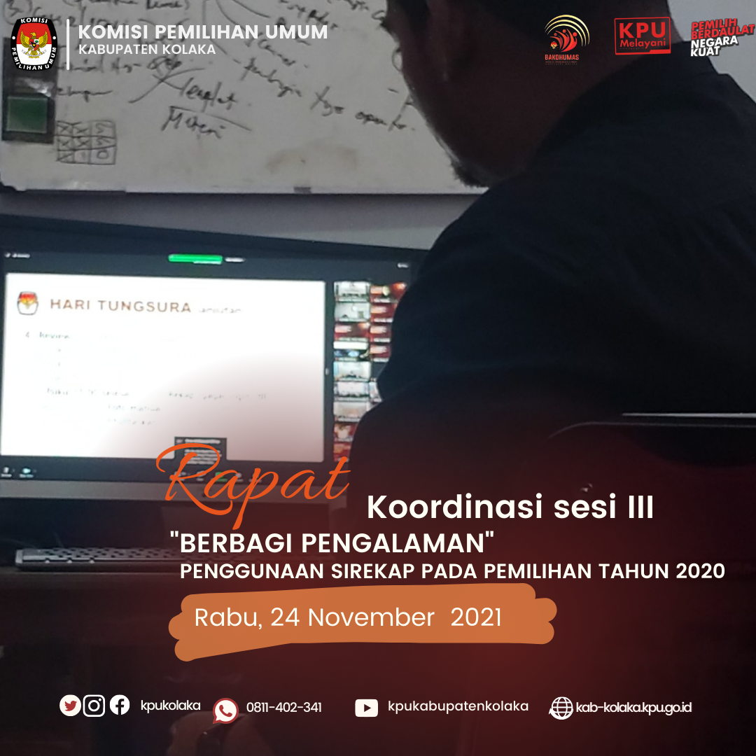 #TemanPemilih, Hari ini Rabu 24 November 2021,KPU Kabupaten Kolaka mengikuti Zoom Meeting Rapat Koordinasi Sesi III Terkait Berbagi Pengalaman Penggunaan Sirekap pada pemilihan tahun 2020. Kegiatan ini diikuti oleh Ketua dan anggota KPU, Kordinator divisi Teknis, Kasubag. Teknis dan Hupmas serta Operator Sirekap KPU Kabupaten Kolaka.